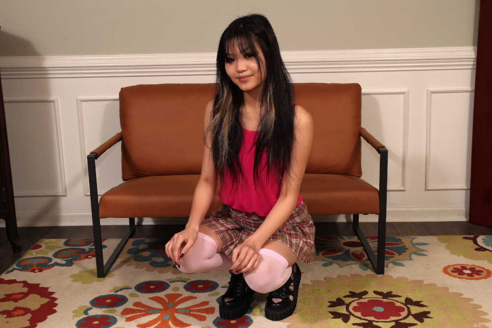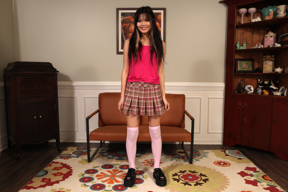 Jia Zi wearing a plaid skirt. Chinese girl in a Catholic schoolgirl uniform. She shows her petite body and enjoys inserting things into her tight hole.