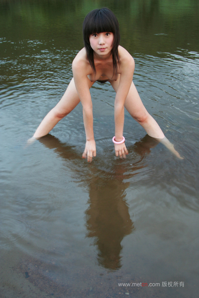 Zhang Xiaoyu artistic nude photoshoot by the water at dusk. The beautiful Chinese model poses in the water and at the mountain.